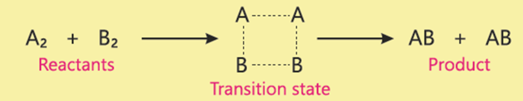Ans. When the two reactant molecules are mixed, all these molecules start colliding with each other. The collisions that result from colliding molecules having average or less than average kinetic energies may not be able to produce any result. But when the two excited molecules from both the reactants collide with each other, they may be able to produce the transition state as shown in the following.