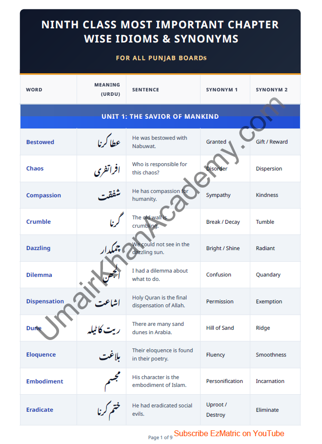 9th Class English Chapter-Wise Idioms and Synonyms